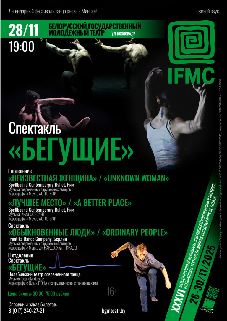 Афиша ноябрь 2025 Афиша ноябрь декабрь Мастерская петра фоменко в минске! 15, 16 ноября в 18:00 И.Бунин «Последние свидания» драма большой зал 18+ 18, 19 ноября в 19:00 Ю.Титов «Мой Брель» необычные истории большой зал 16+ 21 ноября в 19:0022 ноября 18:00 А.Островский «Волки и овцы» комедия большой зал 12+ 15 ноября,суббота18:00 А.Шутов «СкелеТЫ» спектакль-интерактив малый зал 18+ 16 ноября,воскресенье11:3013:00 А.Ревченко, А.Шутов «ИСТОРИЯ ФАРФОРОВОГО КРОЛИКА» сказка-интерактив для детей малый зал/сцена 4+ 18 ноября,вторник19:00 Сценическая версия театра «Шинель. Гоголь.» хореографический спектакль малый зал 12+ 19 ноября,среда19:00 М.Хейфец «Не забудьте расписаться» комедия малый зал 18+ 20 ноября,четверг19:00 Сценическая версия театра «СОПРИКОСНОВЕНИЕ» пластический спектакль малый зал 12+ 21 ноября,пятница19:00 М.Хейфец «СПАСТИ КАМЕР-ЮНКЕРА ПУШКИНА» история одного несостоявшегося подвига малый зал 16+ 22 ноября,суббота18:00 Сценическая версия театра «Кто я?» черная комедия малый зал 16+ 23 ноября,воскресенье18:00 А.Буяльская премьера!«Хрупкость» хореографический спектакль малый зал 12+ 23 ноября,воскресенье18:00 Сценическая версия театра «Идиоты» лирический детектив большой зал 16+ 25 ноября,вторник19:00 В.Гуркин премьера!«Любовь и голуби» лирическая комедия большой зал 16+ 26 ноября,среда19:00 К.Гольдони «ТРАКТИРЩИЦА» комедия в двух действиях большой зал 16+ 27 ноября,четверг19:00 А.Вампилов премьера!«Старший сын» мелодрама большой зал 14+ 28 ноября,пятница19:00 IFMC 2025 в Минске «Бегущие» вечер спектаклей современной хореографии большой зал 16+ 29 ноября,суббота11:30 К.Шталенкова премьера!«Спящая красавица» волшебная сказка для детей большой зал 3+ 29 ноября,суббота18:00 Р.Овчинников «С наступающим!» почти комедия большой зал 18+ 30 ноября,воскресенье18:00 Сценическая версия театра «СВОБОДНАЯ ЛЮБОВЬ» итальянская комедия большой зал 18+ декабрь Справки и заказ билетов по телефону:8-017 240-27-21Начало вечерних спектаклей — суббота, воскресенье в 18.00Бронь билетов, забронированных в кассе театра, снимается за 30 минут до начала спектакля
