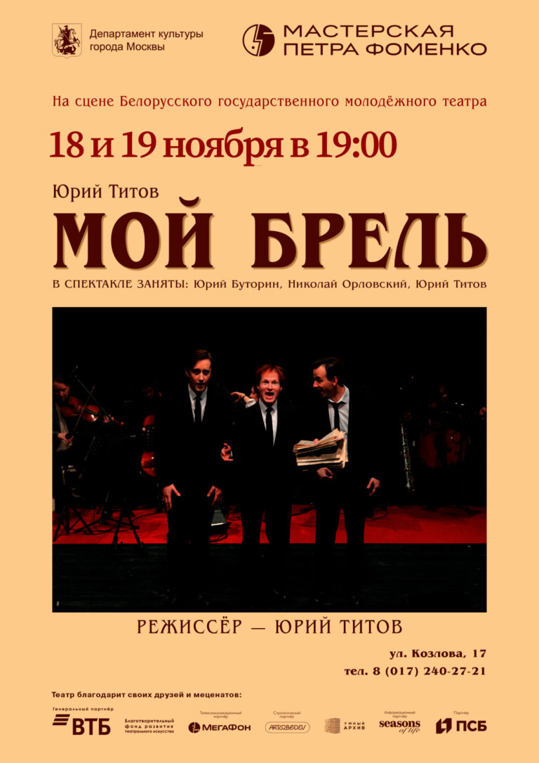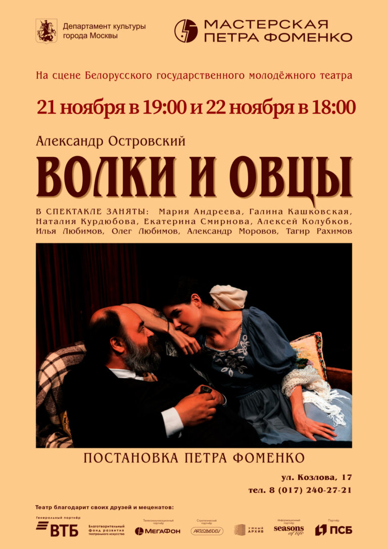 Афиша ноябрь 2025 Афиша октябрь ноябрь декабрь 4 ноября,вторник19:00 К.Балтруков «Красота» хореографический спектакль малый зал 16+ 6 ноября,четверг19:00 Е.Иоос премьера!«цветы для элджернона» драма большой зал 16+ 8 ноября,суббота18:00 Е.Иоос премьера!«цветы для элджернона» драма большой зал 16+ 9 ноября,воскресенье18:00 Д.Патрик «ДОРОГАЯ ПАМЕЛА» мелодрама большой зал 16+ 11 ноября,вторник19:00 М.Камолетти «СЫГРАЕМ В ДРУЖНУЮ СЕМЬЮ» гарнир по-французски большой зал 16+ 12 ноября,среда19:00 В.Ольховская «ТРИКСТЕР КЛУБ» мистическая комедия большой зал 16+ 12 ноября,среда19:00 А.Буяльская премьера!«Хрупкость» хореографический спектакль малый зал 12+ 13 ноября,четверг19:00 Г.Греков премьера!«Остановка» мокьюментари для театра большой зал 16+ Мастерская петра фоменко в минске! 15, 16 ноября в 18:00 И.Бунин «Последние свидания» драма большой зал 16+ 18, 19 ноября в 19:00 Ю.Титов «Мой Брель» необычные истории большой зал 16+ 21 ноября в 19:0022 ноября 18:00 А.Островский «Волки и овцы» комедия большой зал 12+ 15 ноября,суббота18:00 А.Шутов «СкелеТЫ» спектакль-интерактив малый зал 18+ 16 ноября,воскресенье11:3013:00 А.Ревченко, А.Шутов «ИСТОРИЯ ФАРФОРОВОГО КРОЛИКА» сказка-интерактив для детей малый зал/сцена 4+ 18 ноября,вторник19:00 Сценическая версия театра «Шинель. Гоголь.» хореографический спектакль малый зал 12+ 19 ноября,среда19:00 М.Хейфец «Не забудьте расписаться» комедия малый зал 18+ 20 ноября,четверг19:00 Сценическая версия театра «СОПРИКОСНОВЕНИЕ» пластический спектакль малый зал 12+ 21 ноября,пятница19:00 М.Хейфец «СПАСТИ КАМЕР-ЮНКЕРА ПУШКИНА» история одного несостоявшегося подвига малый зал 16+ 22 ноября,суббота18:00 Сценическая версия театра «Кто я?» черная комедия малый зал 16+ 23 ноября,воскресенье18:00 А.Буяльская премьера!«Хрупкость» хореографический спектакль малый зал 12+ 23 ноября,воскресенье18:00 Сценическая версия театра «Идиоты» лирический детектив большой зал 16+ 25 ноября,вторник19:00 В.Гуркин премьера!«Любовь и голуби» лирическая комедия большой зал 16+ 26 ноября,среда19:00 К.Гольдони «ТРАКТИРЩИЦА» комедия в двух действиях большой зал 16+ 27 ноября,четверг19:00 А.Вампилов премьера!«Старший сын» мелодрама большой зал 14+ 28 ноября,пятница19:00 У.Бетти «КОЗИЙ ОСТРОВ» история в двух частях большой зал 18+ 29 ноября,суббота11:30 К.Шталенкова премьера!«Спящая красавица» волшебная сказка для детей большой зал 3+ 29 ноября,суббота18:00 Р.Овчинников «С наступающим!» почти комедия большой зал 18+ 30 ноября,воскресенье18:00 Сценическая версия театра «СВОБОДНАЯ ЛЮБОВЬ» итальянская комедия большой зал 18+ октябрь декабрь Справки и заказ билетов по телефону:8-017 240-27-21Начало вечерних спектаклей — суббота, воскресенье в 18.00Бронь билетов, забронированных в кассе театра, снимается за 30 минут до начала спектакля