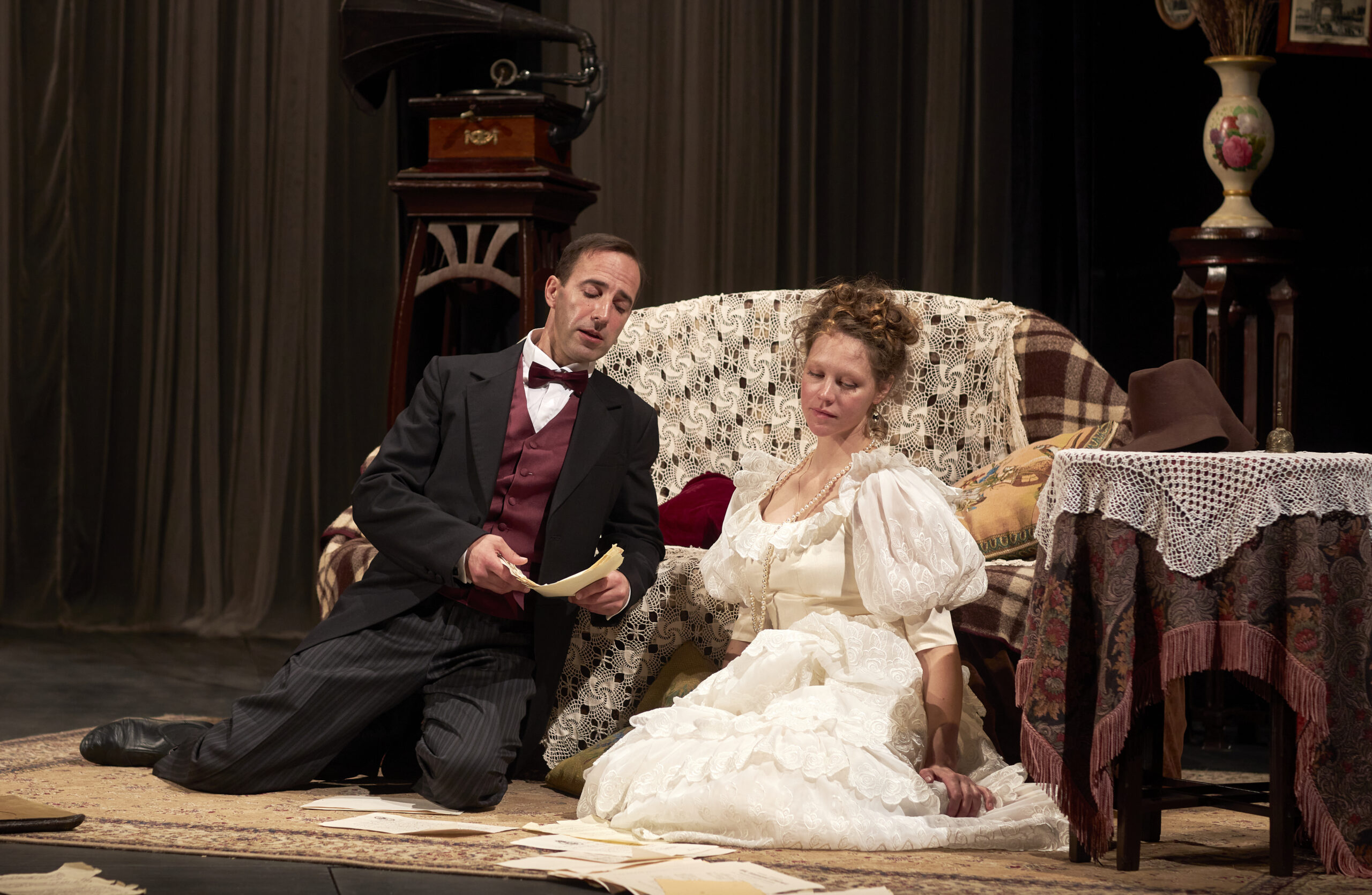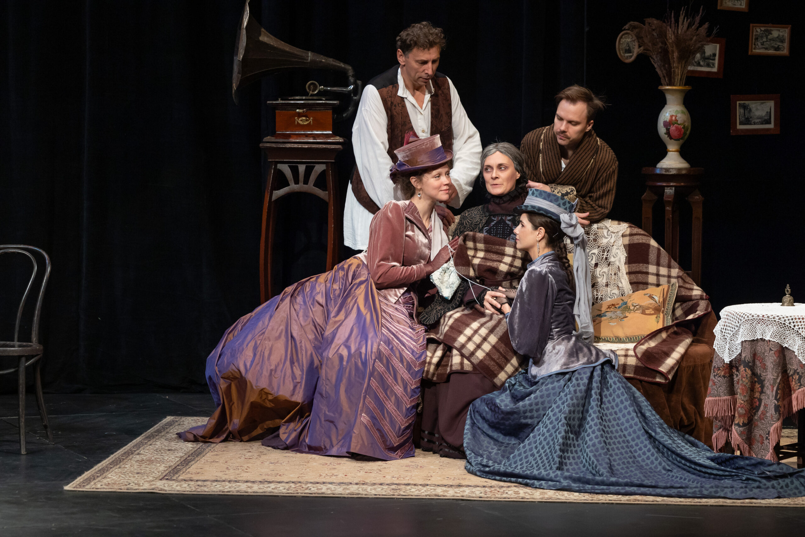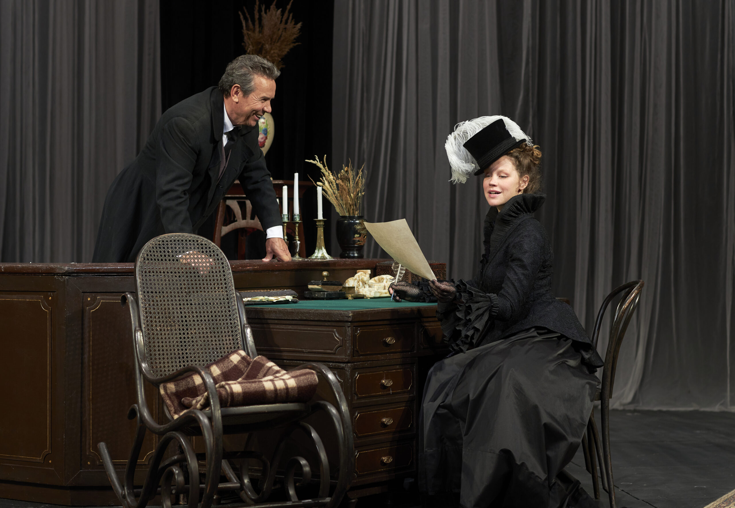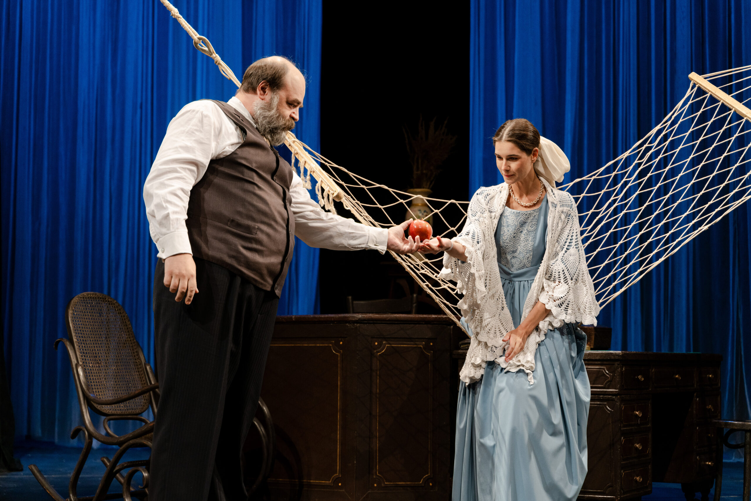 Этот спектакль, очень бережный по отношению к классику, открывает в произведении совершенно новые грани. Здесь и переливы света, и «разомкнутость» пространства, и легкая грусть, и поэзия ушедшего мира русской усадьбы — чеховский импрессионизм, и, конечно, юмор. Собственно сюжет пьесы — аферы с векселями — подается остро, подчас гротескно. Современные ассоциации не подчеркиваются режиссером, они приходят сами собой.